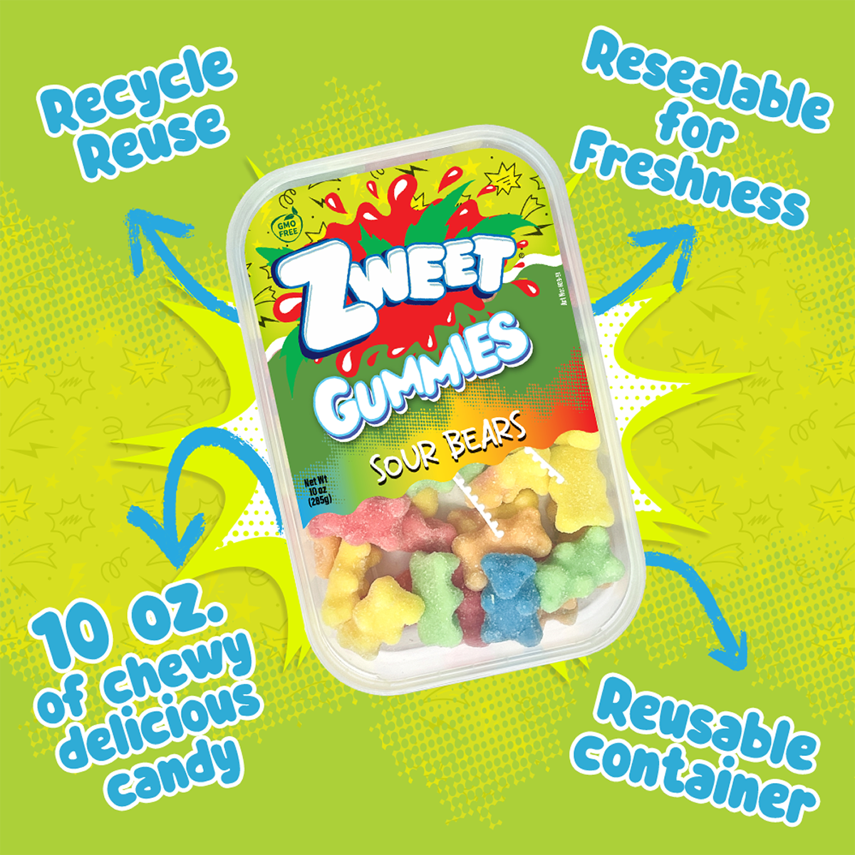 Zweet Sour Bear Gummies are packed with a punch of fruity flavor. These chewy gummies are a fun treat for everyone! You can bear-ly resist this tasty snack!